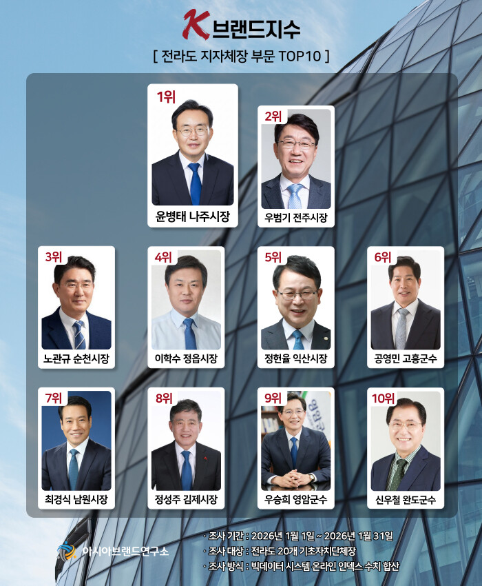 ‘K-브랜드지수’ 전라도 지자체장 부문은 1위 윤병태 나주시장에 이어 우범기 전주시장(2위), 노관규 순천시장(3위), 이학수 정읍시장(4위), 정헌율 익산시장(5위), 공영민 고흥군수(6위), 최경식 남원시장(7위), 정성주 김제시장(8위), 우승희 영암군수(9위), 신우철 완도군수(10위) 등이 TOP10에 이름을 올렸다.