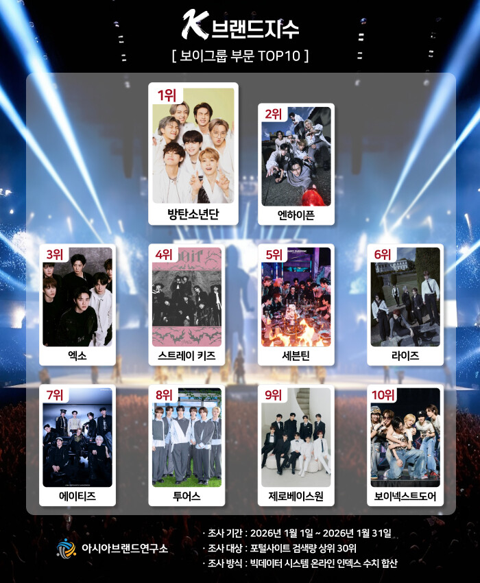 이번 K-브랜드지수 보이그룹 부문은 포털사이트 검색량 상위 30위를 대상으로, 2026년 1월 1일부터 1월 31일까지의 온라인 빅데이터 6억 5786만 2300건을 분석했다.